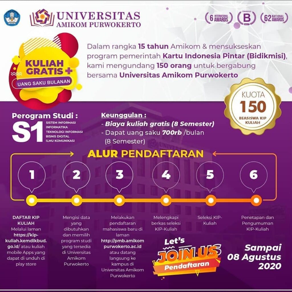 Dalam Rangka 15th Amikom Purwokerto & mensukseskan program pemerintah Kartu Indonesia Pintar (Bidikmisi), kami mengundang 150 orang untuk bergabung bersama Universitas Amikom Purwokerto