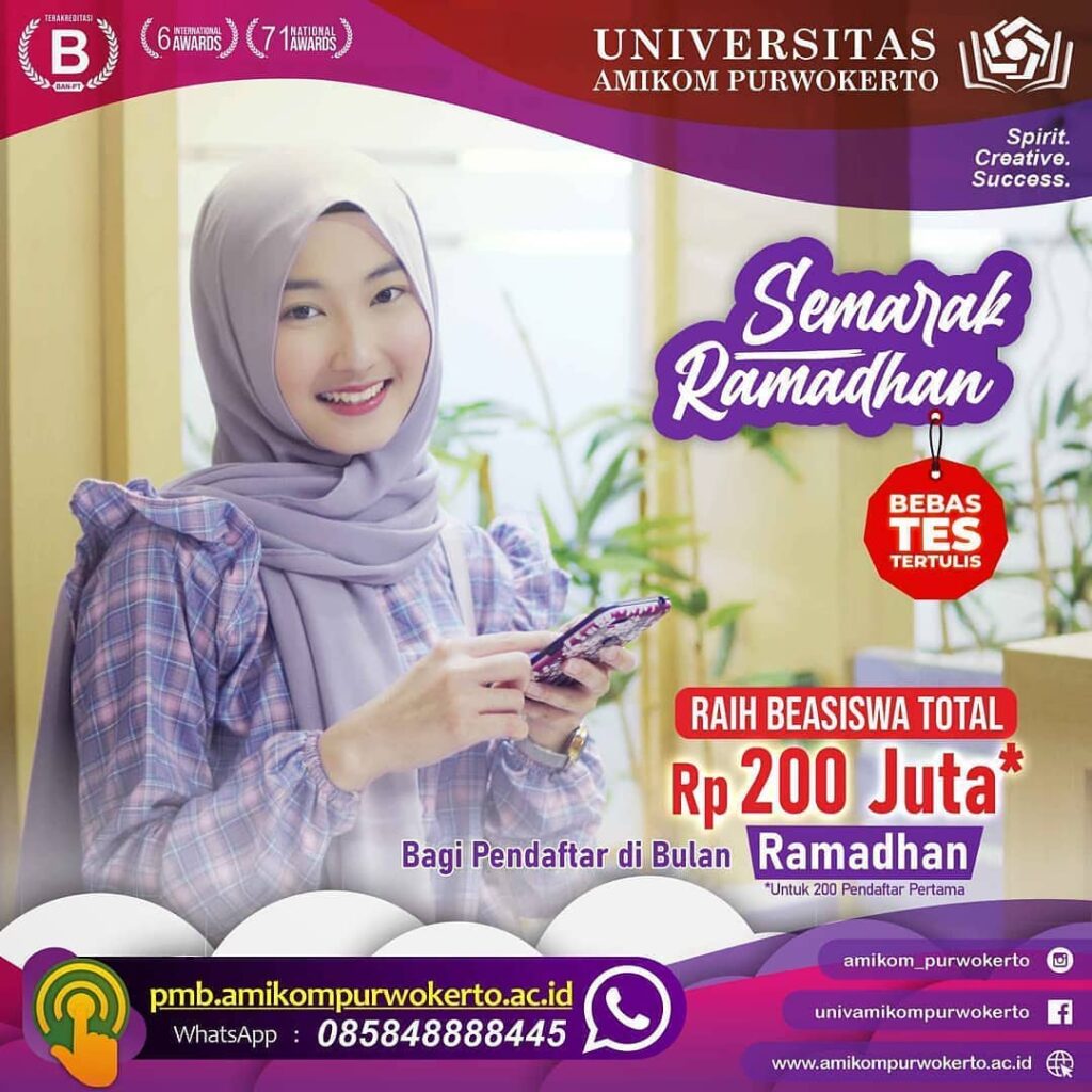 Hi sobat Millennials. Di bulan Ramadhan yang penuh berkah ini, Universitas Amikom Purwokerto mengadakan program berbagi beasiswa Ramadhan senilai total Rp 200.000.000 bagi yang mendaftar di bulan Ramadhan (12 April – 12 Mei)